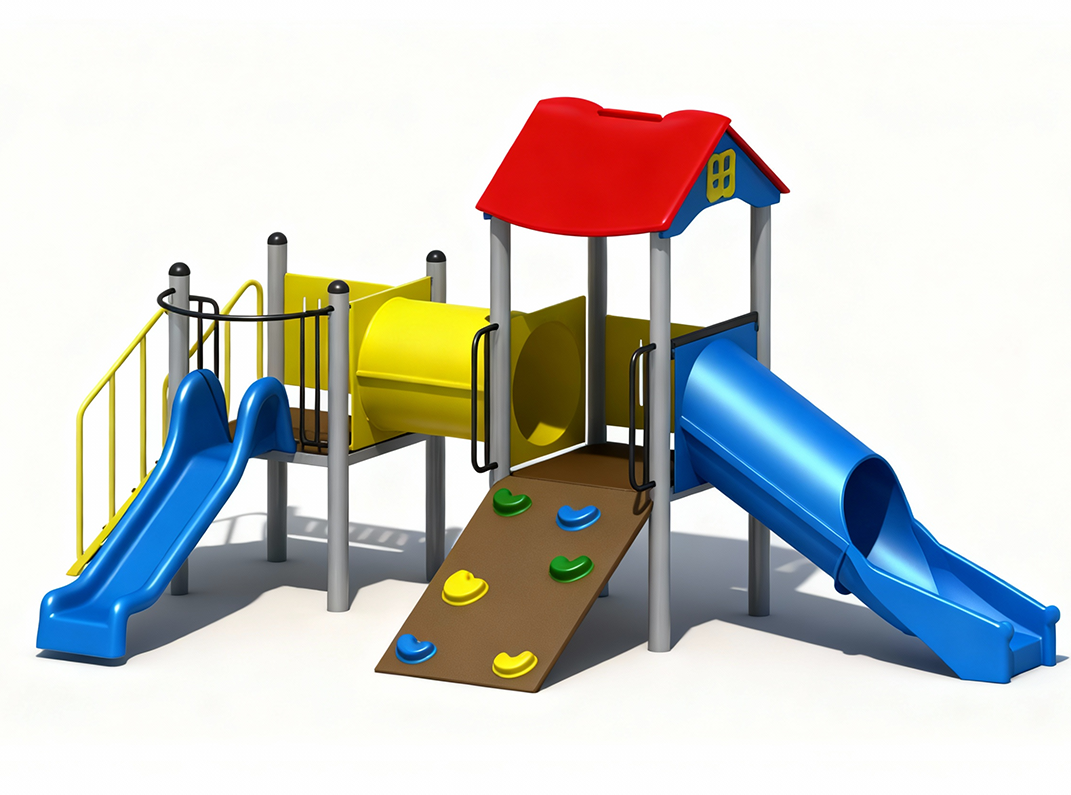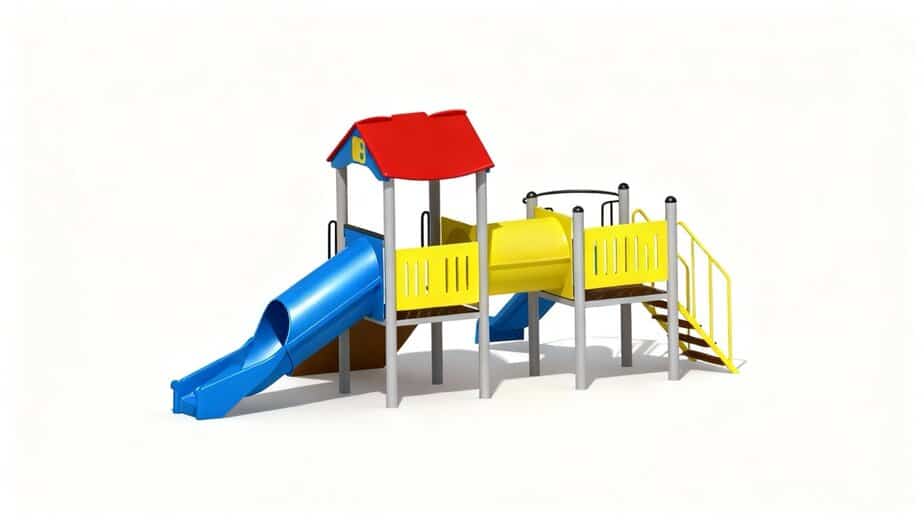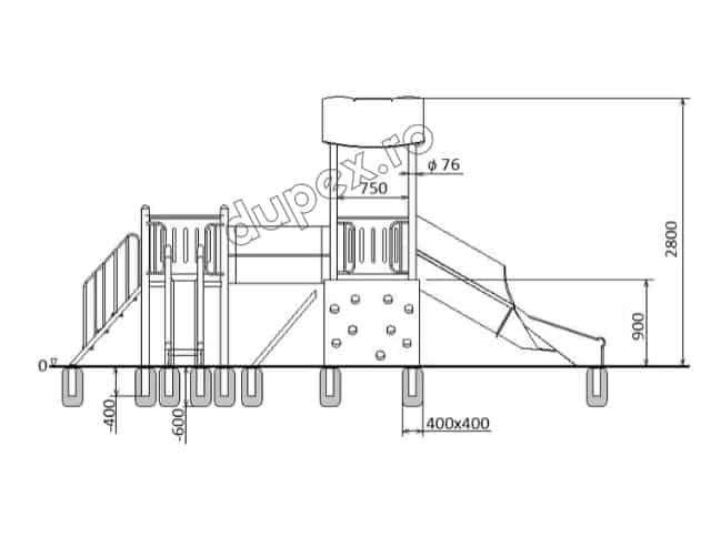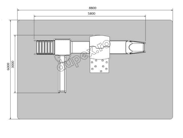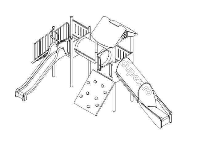 2 tobogane din fibra de sticla (PAFS), 1 perete catarare, 1 tub legatura, 1 turn, 1 platforma. |