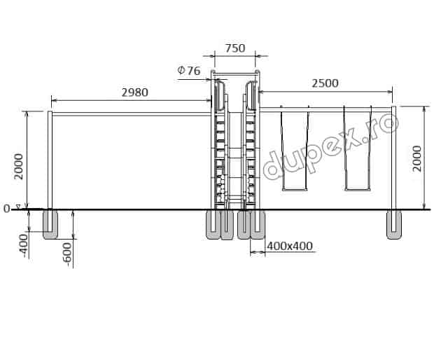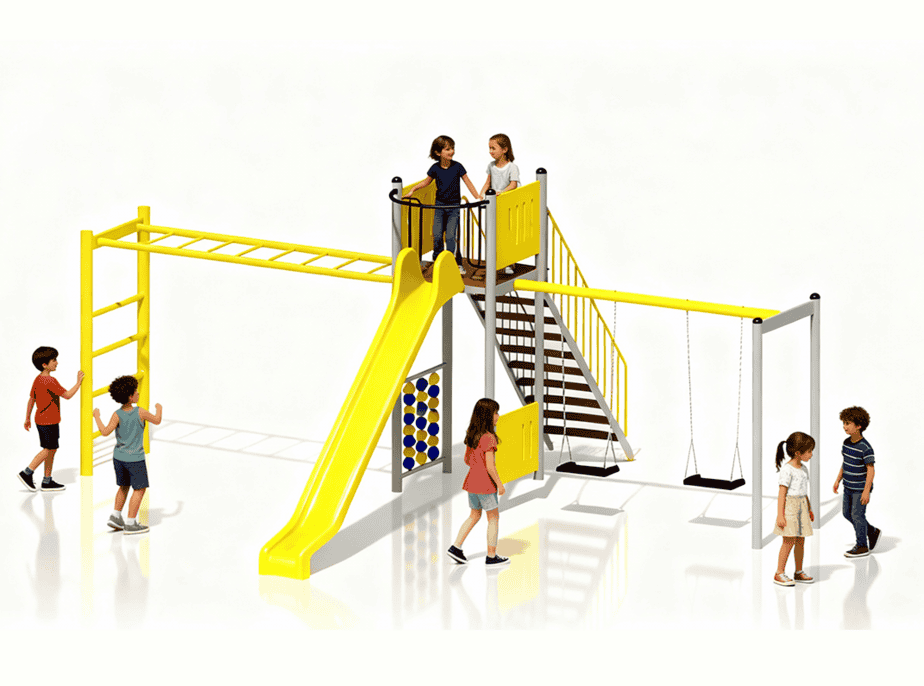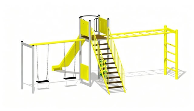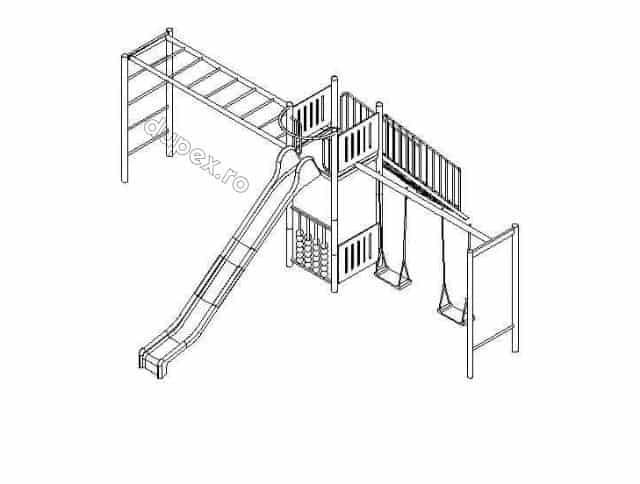 1 tobogan din fibra de sticla (PAFS), 1 platforma, 1 sistem catarare, 1 socotitoare, 1 leagan dublu. |