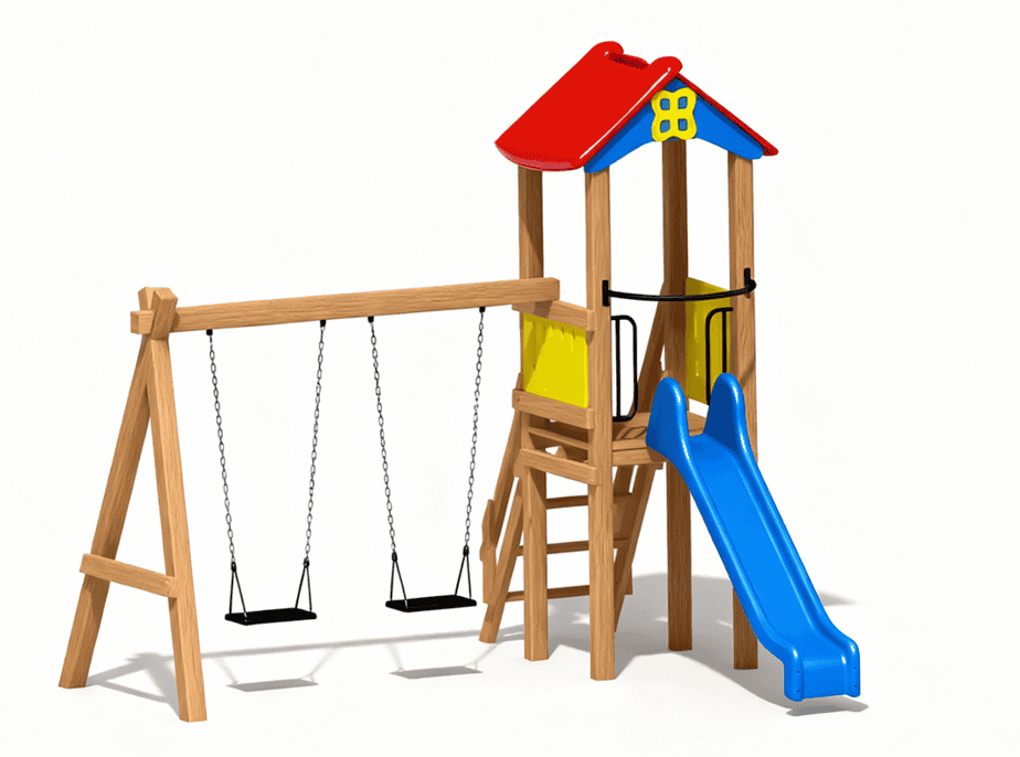 Produsul Complex de Joaca CJ.12.02N este confectionat din structura de lemn. Acoperit cu bait si lac pe baza de apa, este rezistent la intemperii.