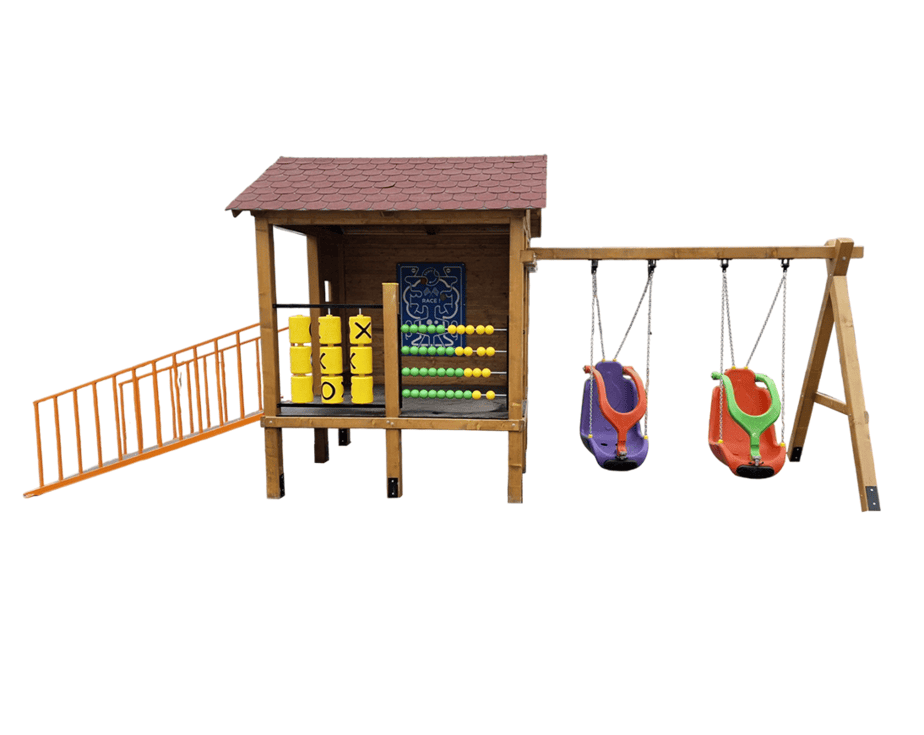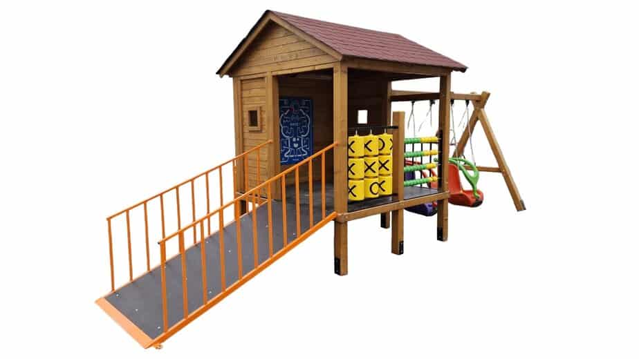 2 leagane pentru persoane cu dizabilitati, 1 rampa acces, o casuta cu jocuri interactive. |