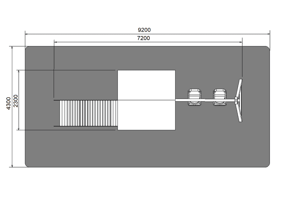L x I = 7200 x 2300 mm, H = 2650 mm. |