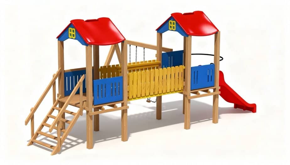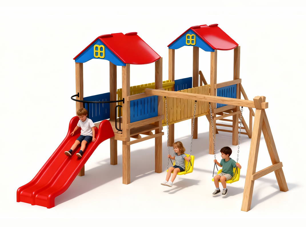 Produsul Complex de Joaca CJ.15 este confectionat din structura de lemn. Acoperit cu bait si lac pe baza de apa, este rezistent la intemperii.
