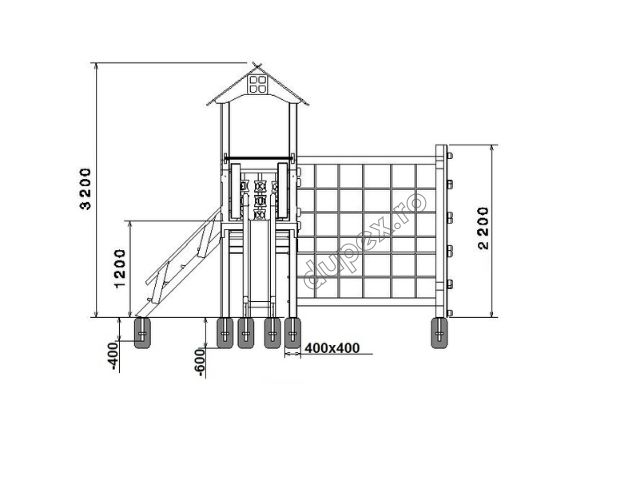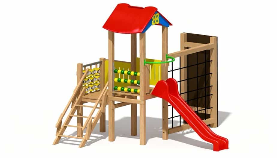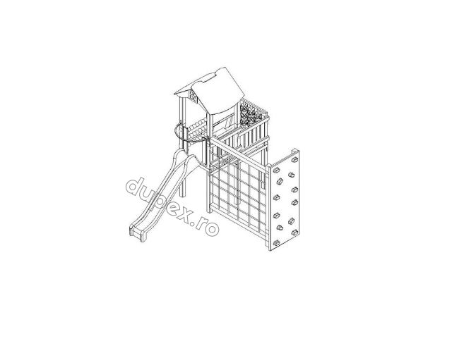 1 tobogan din fibra de sticla (PAFS), un turn, o platforma, un modul catarare, o socotitoare, un joc X/O.