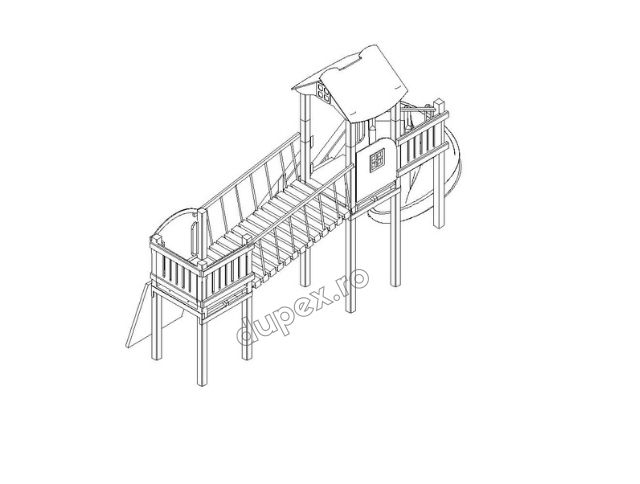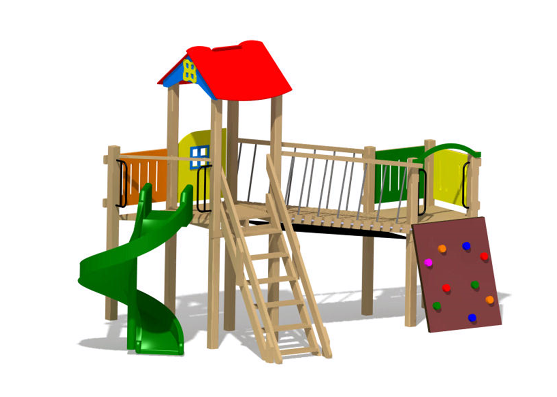 Produsul Complex de Joaca CJ.23.01N este confectionat din structura de lemn. Acoperit cu bait si lac pe baza de apa, este rezistent la intemperii.