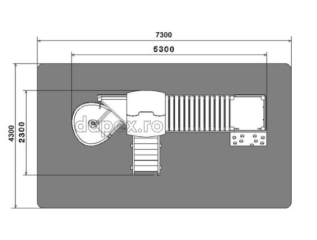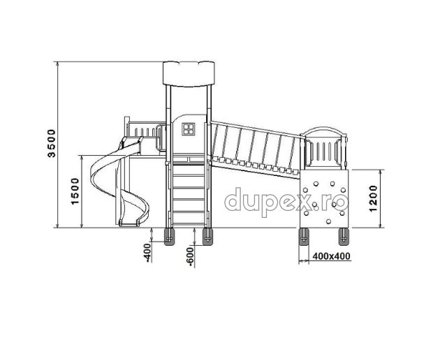 1 tobogan din fibra de sticla (PAFS), 1 perete catarare, 1 turn, 2 platforme. |