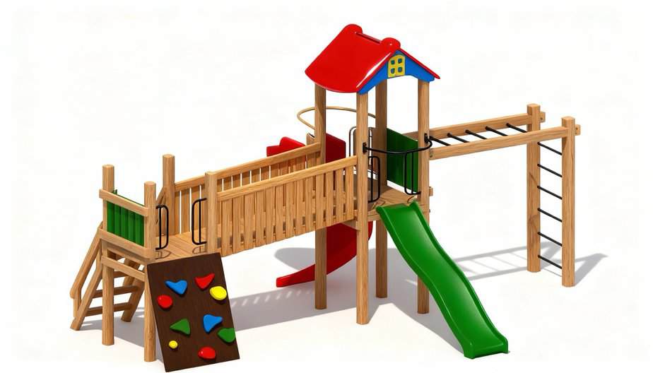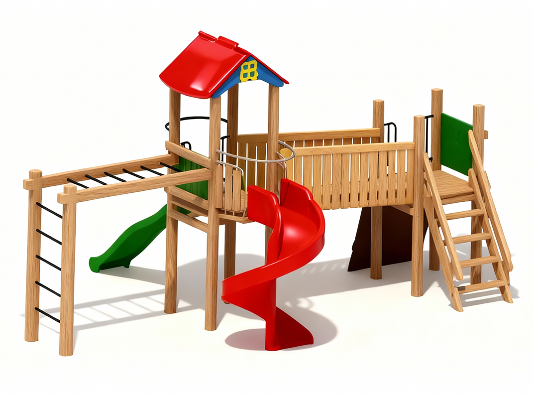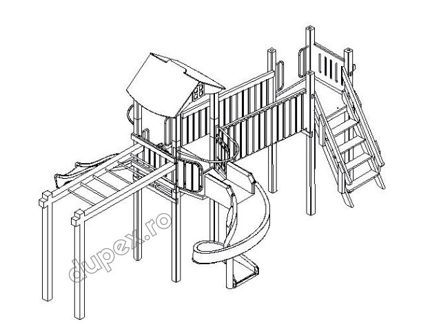 Produsul Complex de Joaca CJ.23N este confectionat din structura de lemn. Acoperit cu bait si lac pe baza de apa, este rezistent la intemperii.