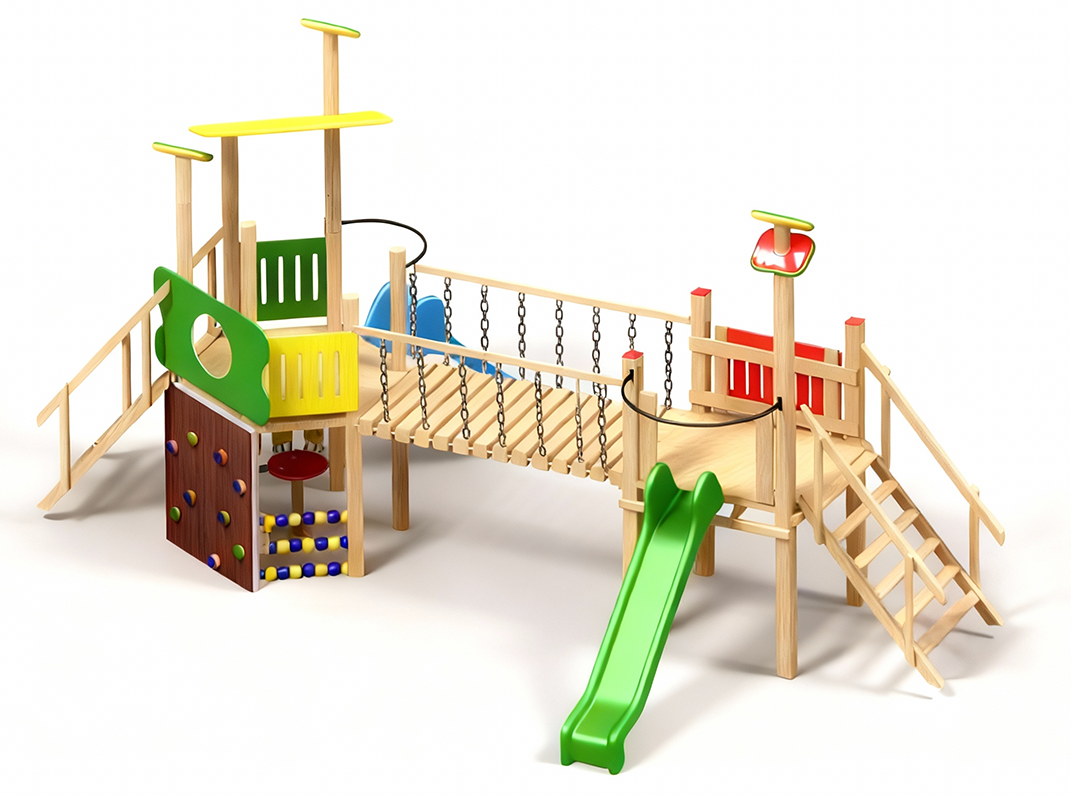 Produsul Complex de Joaca CJ.24N este confectionat din structura de lemn. Acoperit cu bait si lac pe baza de apa, este rezistent la intemperii.