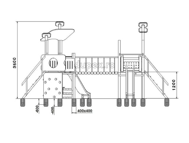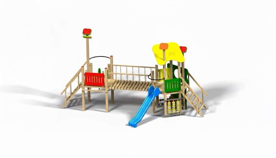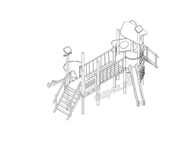 2 tobogane din fibra de sticla (PAFS), 2 scari, 1 socotitoare, 1 perete catarere, 1 turn, 1 platforma.