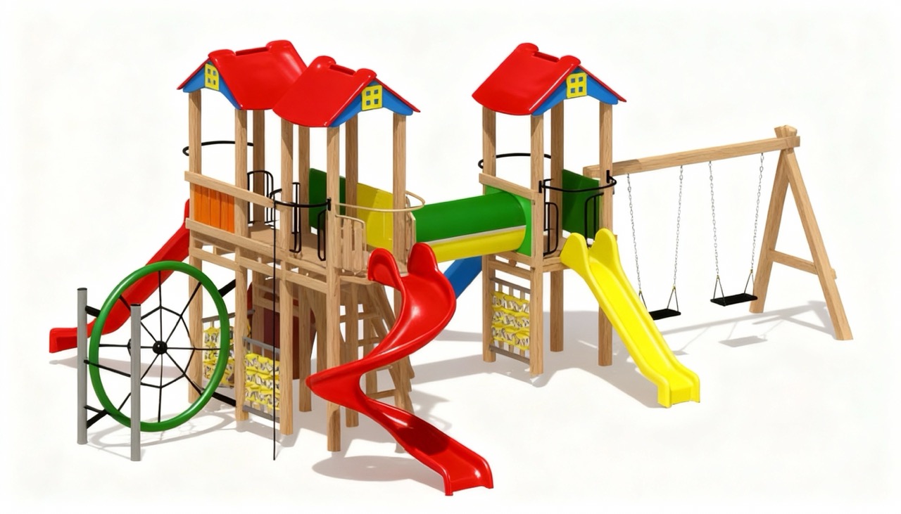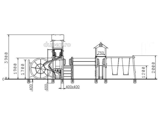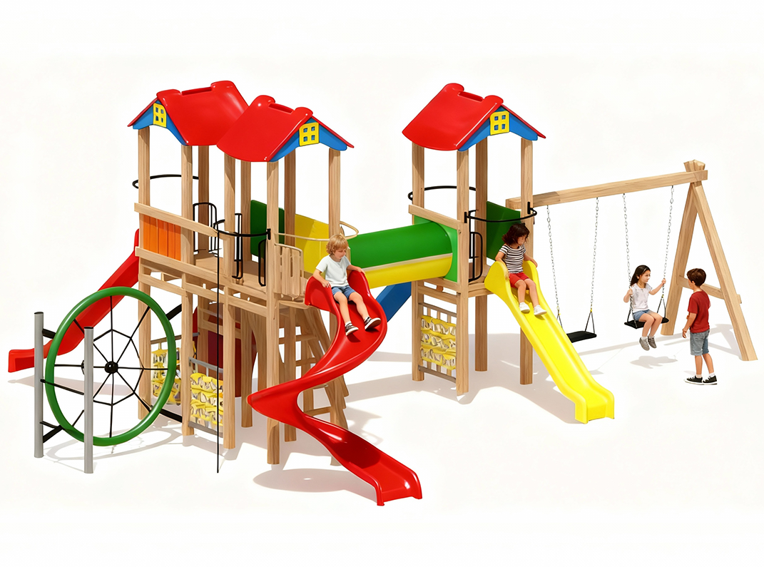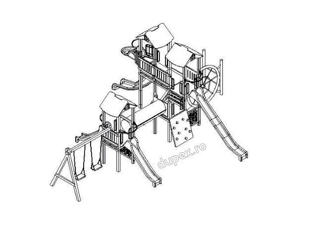 4 tobogane din fibra de sticla (PAFS), 1 leagan dublu, 1 plasa catarare, 1 perete catarare, , 1 tub legatura. |