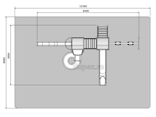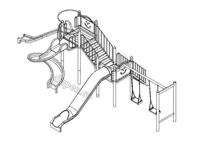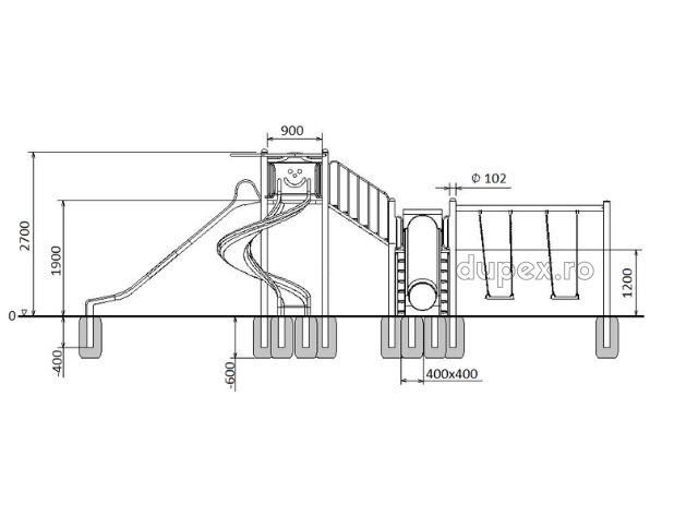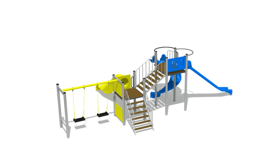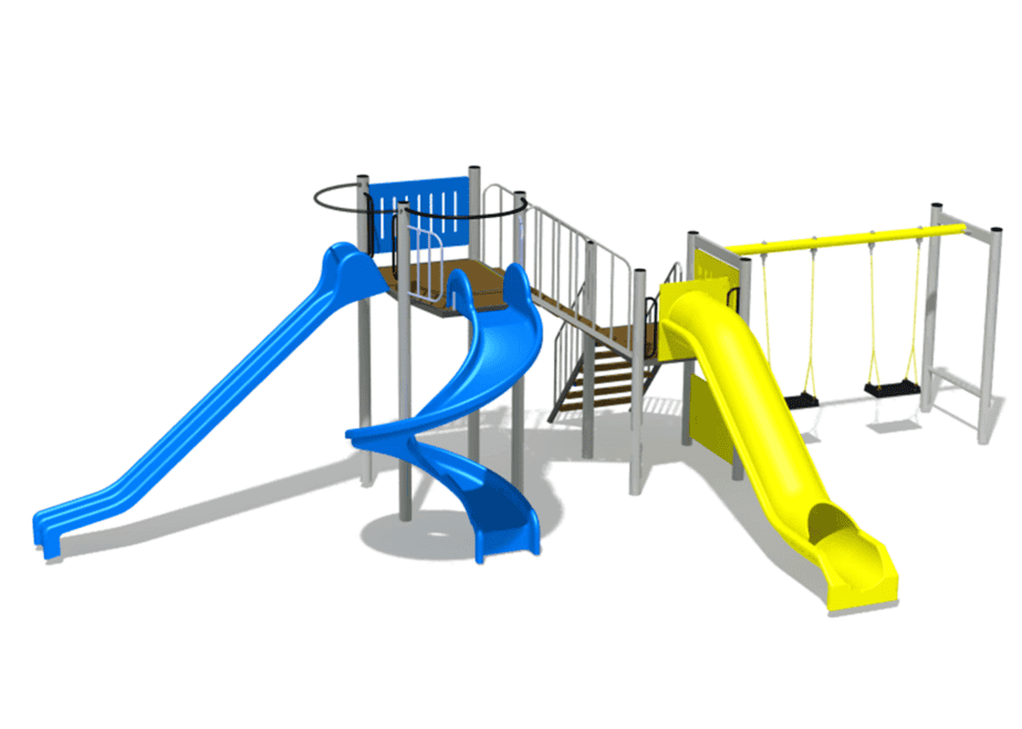 3 tobogane din fibra de sticla (PAFS), 2 platforme, 1 leagan dublu. |