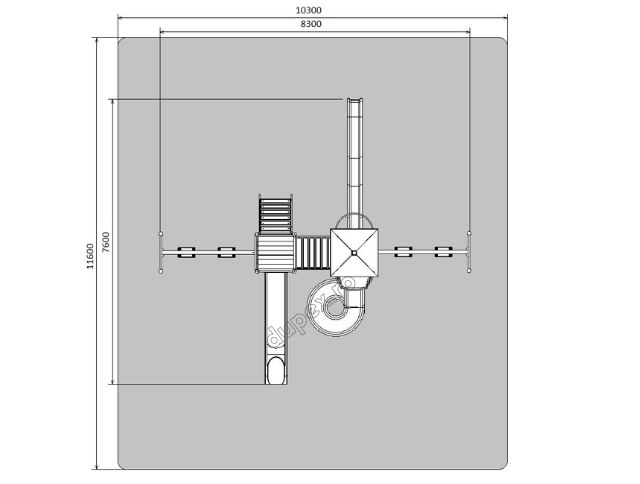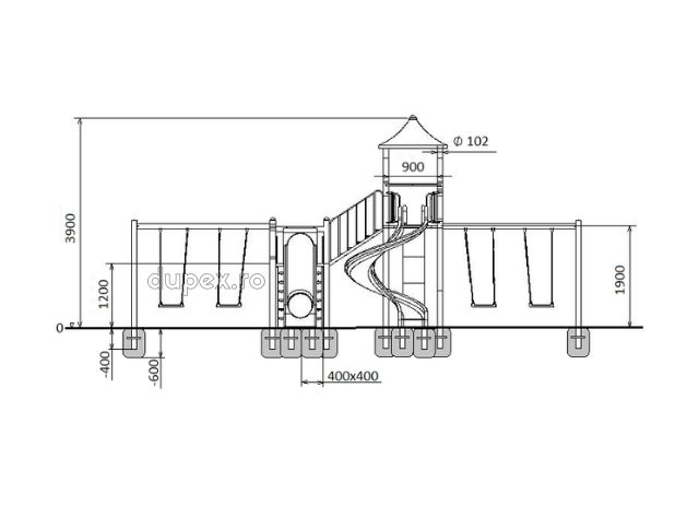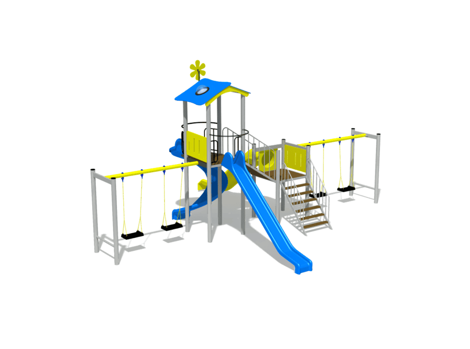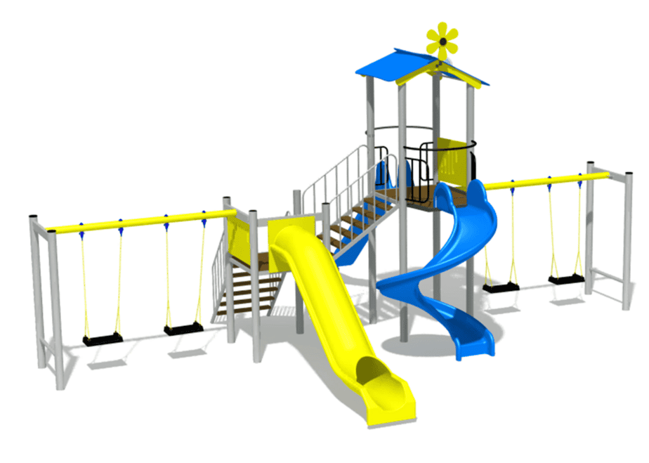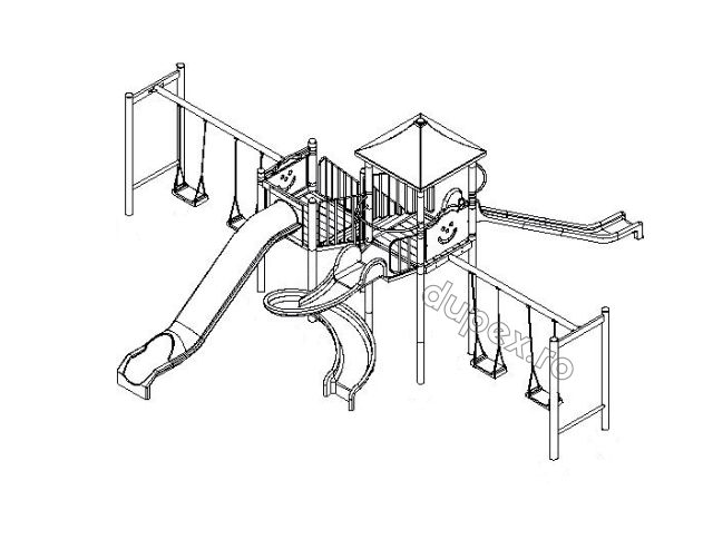 3 tobogane din fibra de sticla (PAFS), 2 leagane duble, 1 turn, 1 platforma. |