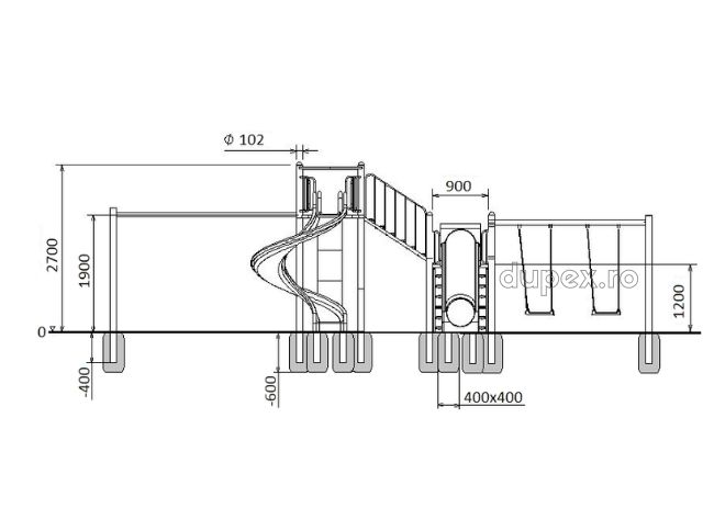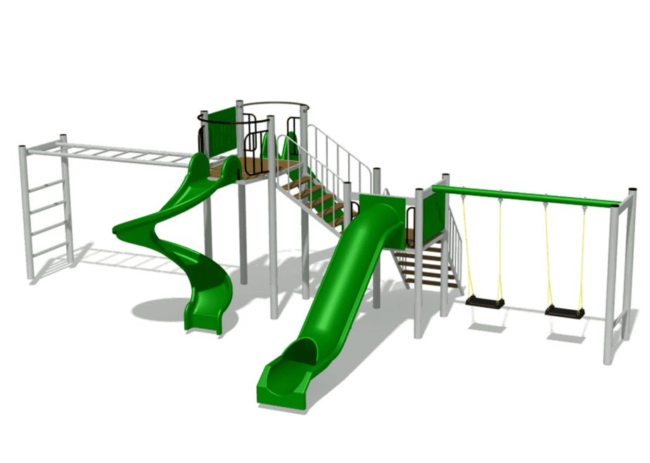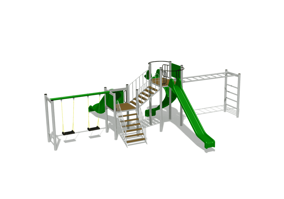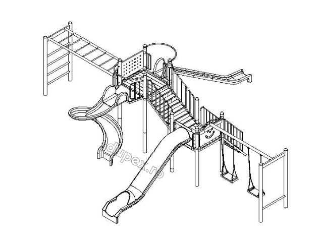 3 tobogane din fibra de sticla (PAFS), 1 leagan dublu, 2 platforme, 1 modul catarare. |