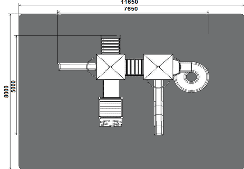 L x I = 7650 x 5000 mm, H = 3800 mm. |