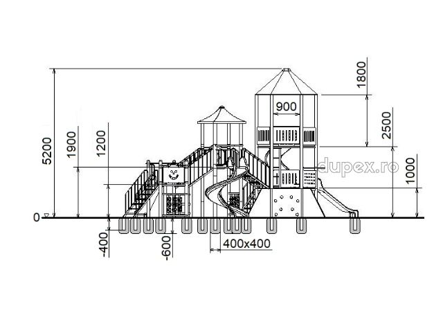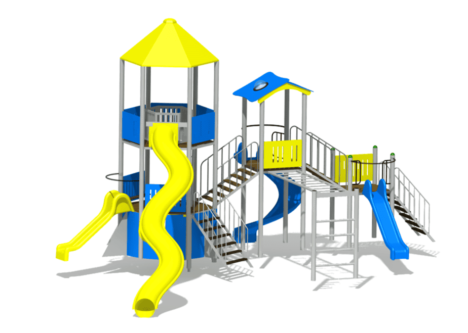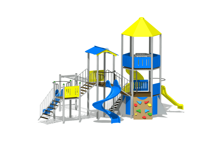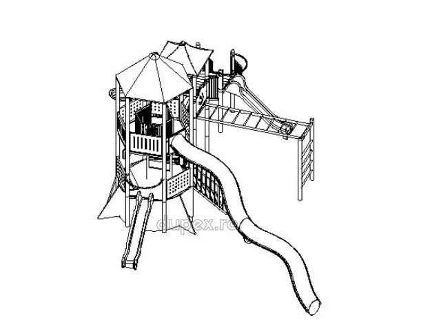 4 tobogane din fibra de sticla (PAFS), 2 turnuri, 1 platforma, 2 jocuri X/O, 1 perete de catarare. |
