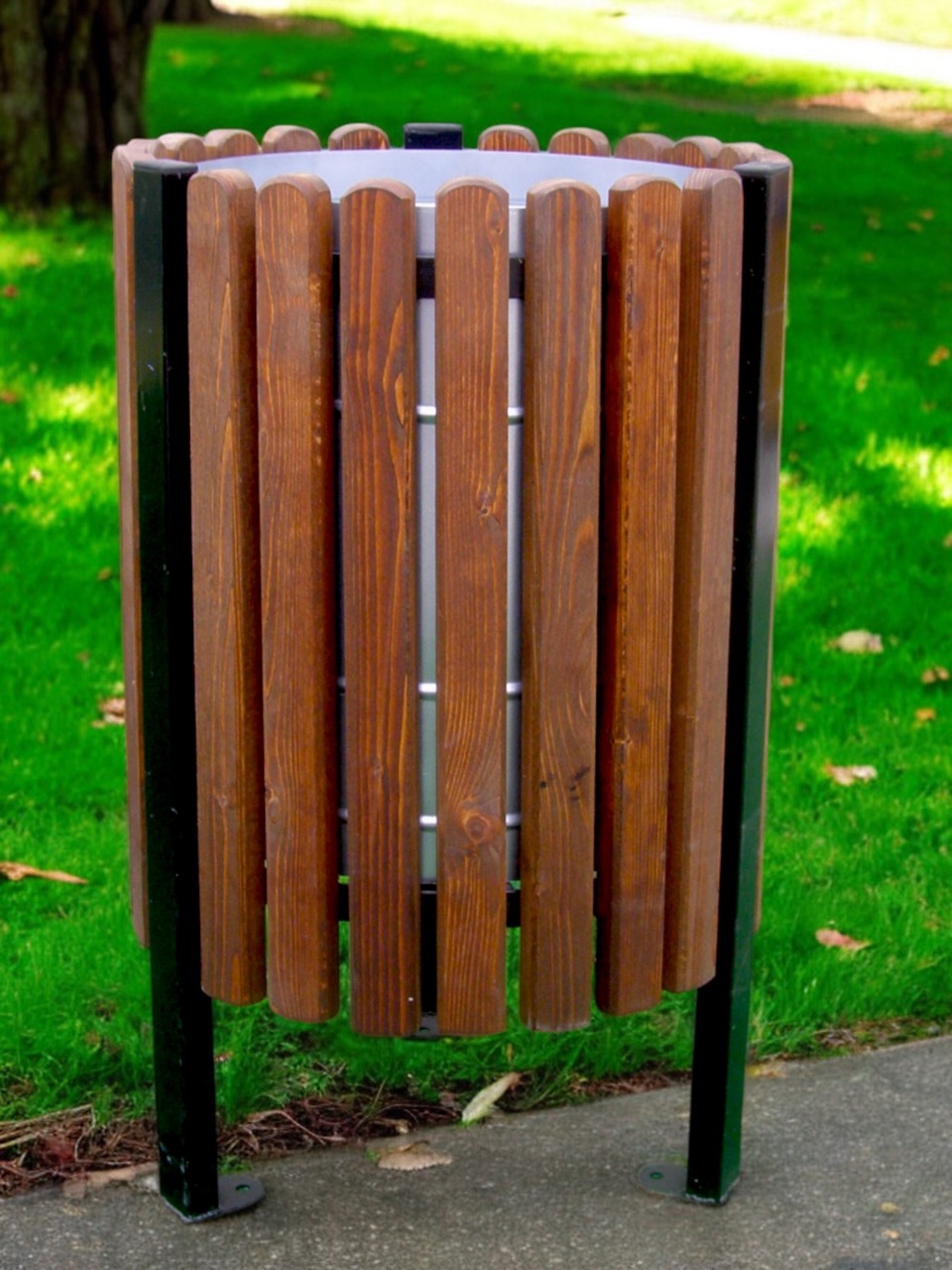 Produsul Cos Gunoi Lemn este confectionat din metal acoperit cu rigle de lemn.
