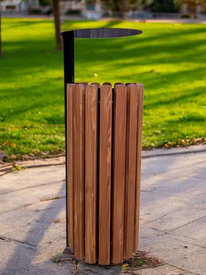 Produsul Cos gunoi lemn cu acoperis este confectionat din metal, acoperit cu lemn. Acoperisul este din metal.