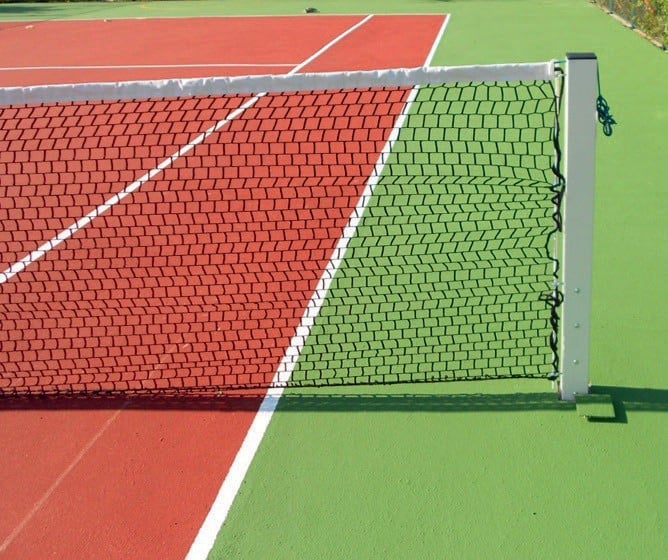 Produsul Fileu Tenis de Camp cu Stalpi Sustinere are 2 stalpi metalici. Plasa este din polietilena, iar banda elastica din PVC. Materiale premium pentru un teren de tenis performant.