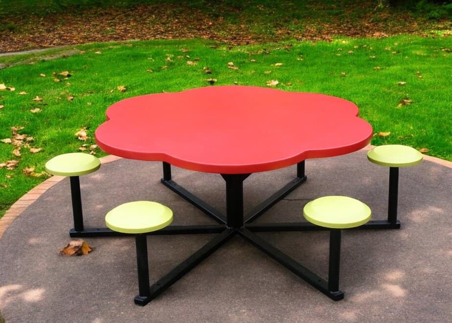 Produsul masa joc copii cu scaunele este confectionat din metal. Grunduit si viu colorat cu vopsele pe apa, este rezistent la intemperii.