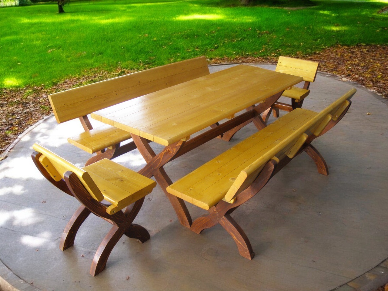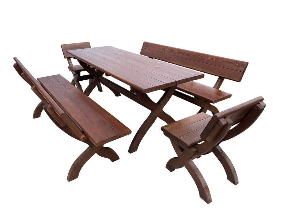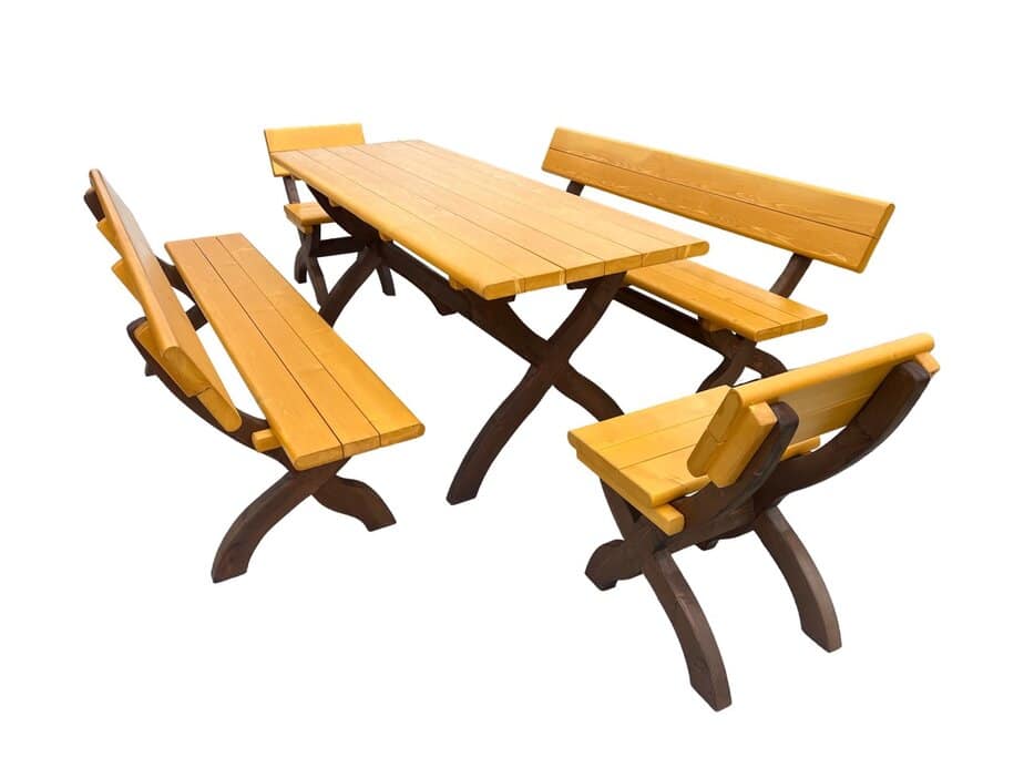 Produsul Set masa lemn 10 persoane este confectionat din lemn. Lacuit, este rezistent la intemperii.