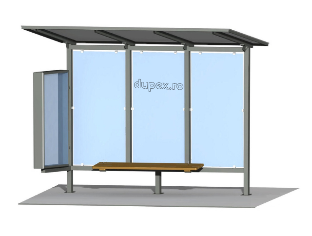 Produsul Statie bus cu banca din WPC – pereti din sticla duplex, acoperis din policarbonat si panou informatii SB.01 este confectionat din structura metalica. Peretii sunt din sticla, iar banca este din WPC.