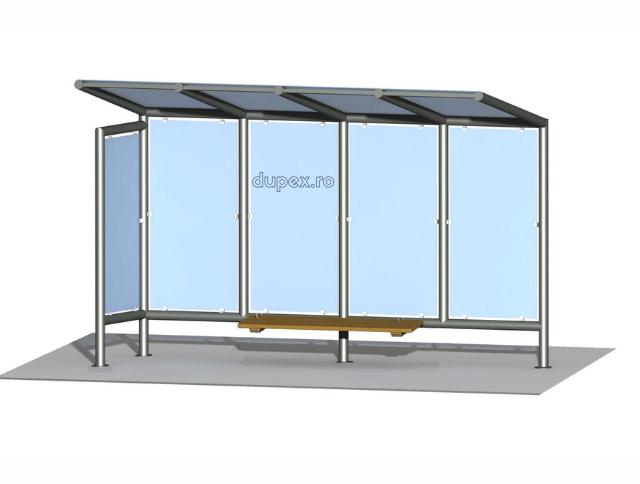 Produsul Statie bus cu banca din WPC – pereti din sticla duplex, acoperis din policarbonat si panou lateral din sticla SB.03 este confectionat din structura metalica. Peretii sunt din sticla, iar banca este din WPC.