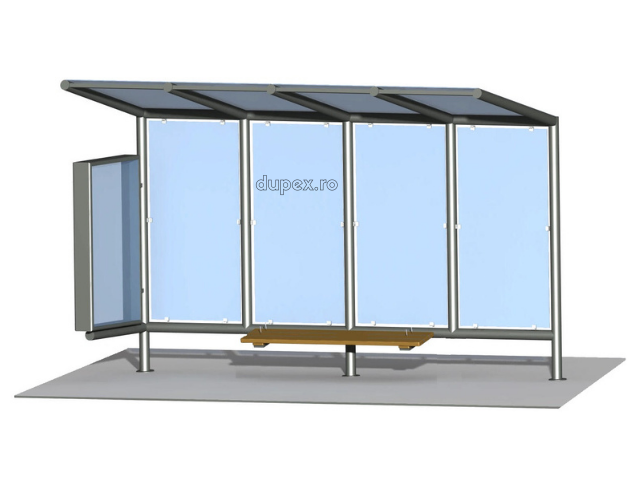 Produsul Statie bus cu banca din WPC – pereti din sticla duplex, acoperis din policarbonat si perete lateral din sticla SB.04 este confectionat din structura metalica. Peretii sunt din sticla, iar banca este din WPC.