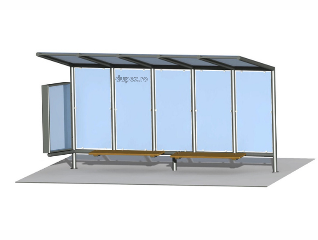 Produsul Statie bus cu banca din WPC – pereti din sticla duplex, acoperis din policarbonat, perete lateral din sticla si panou info SB.05 este confectionat din structura metalica. Peretii sunt din sticla, iar banca este din WPC.