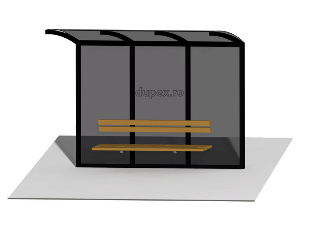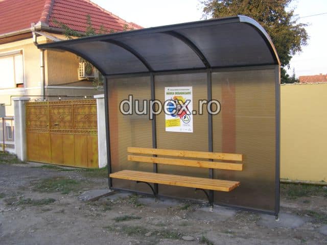 Produsul Statie bus cu banca – pereti policarbonat este confectionat din structura metalica. Peretii sunt din policarbonat, iar banca este din lemn.